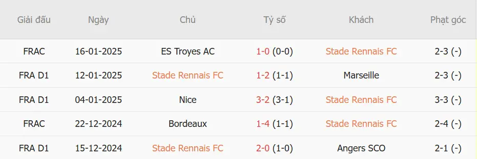 Trong 5 trận gần nhất, Rennes thắng 2, hòa 0, thua 3.