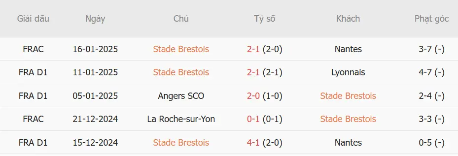 Trong 5 trận gần nhất, Brest thắng 4, hòa 0, thua 1.